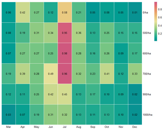 Furthermore, Figure 4, which explains the monthly deviation in TNVOC emissions at the surveyed sites by forest density, shows the largest deviation in monthly phytoncide emissions at the 700/ha site. In addition, the regions of 0, 900, and 1000 tree count per hectare were found to have relatively small deviations compared to other study sites.