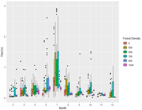 Boxplot of monthly TNVOC (μg/m3) emissions according to forest density.