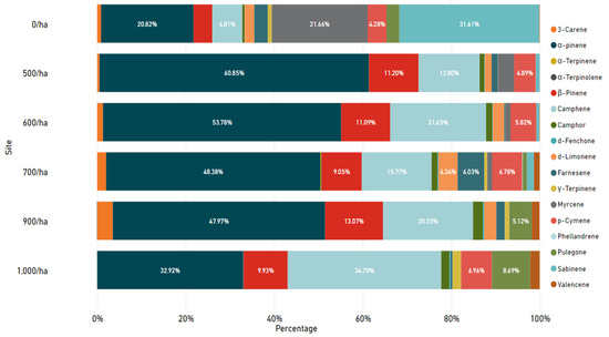 Regarding the types of NVOCs detected for each study site, generally α-Pinene, Camphene, and β-Pinene were detected at high concentrations ratio as shown in Figure 5. Sabinene and Myrcene were detected at higher rates in the 0/ha region than in the other regions, and Farnesene was detected at higher rates in the 700/ha region than in other regions. In addition, while p-Cymene was detected in other sites, no p-Cymene was detected in 900/ha areas, and no 3-Carene and d-Limonene were detected in 1000/ha sites. At the 500/ha, 600/ha, and 700/ha sites, all 17 types of NVOCs were detected, although the proportions of phytoncide components were different.
