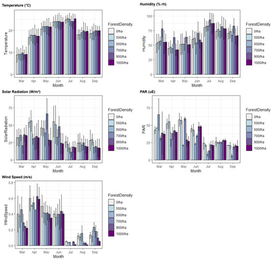 Bar charts of monthly microclimate environment fluxes according to forest density. Units of each microclimate factors: temperature (°C), humidity (% rh), solar radiation (W/m²), PAR (uE), and wind speed (m/s).