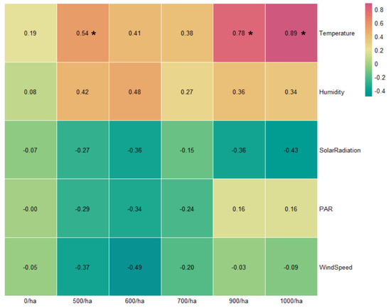 Pearson correlation coefficient results between microclimate factors and TNVOC emissions by forest density (* p < 0.05).