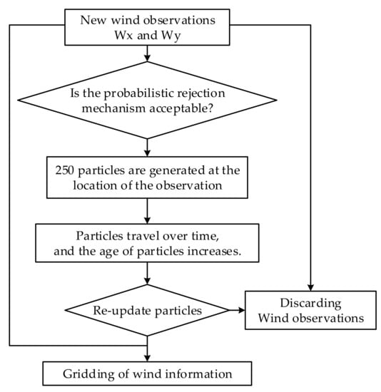 The wind vector of each grid point consists of the weighted values of adjacent particles, and the weight of each particle depends on the distance from the current position of the particle to the grid point, , and the distance from its original position, . The weight values of each factor are shown in Equations (8) and (9). The weight of each particle is determined by the above two factors, thus the total weight of the particle is defined as Equation (10).