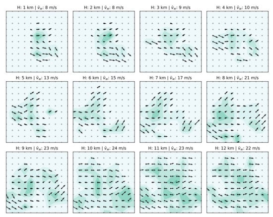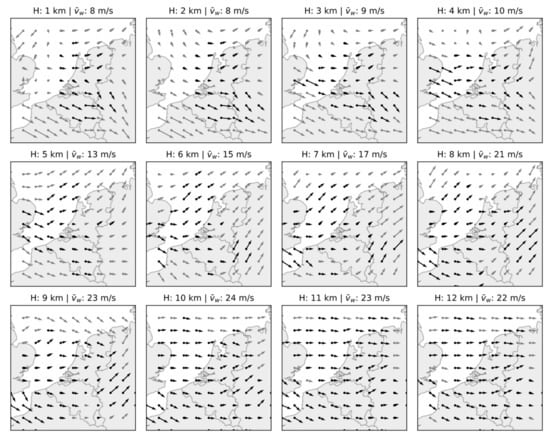 In this paper, ADS-B and Mode S data at 00:00, 06:00, 12:00, and 18:00 UTC on 1 January 2018 were selected for wind field retrieval. It includes the data of half an hour before and after the above four moments, and this experiment uses the data of every 100 s to output a wind field chart. The duration of the input data used has a certain impact on the results, but this effect is beneficial. The increase of real-time length can make the results more accurate, and the model can invert the wind field results from a few minutes to several hours in real-time. However, for the sake of the development of this study and the independence of the results, only short-term and long-term results are reflected in the study. In order to understand the specific distribution of wind speed and direction errors, this paper makes statistics as shown in Figure 3 and Figure 4 [29]. At the same time, the variation trend of wind speed and wind direction is relatively consistent, in which the consistency of wind direction is higher than that of wind speed, and the retrieved data reflect more detailed fluctuations. There are some large abrupt changes in the wind speed, which may be outliers or normal abrupt changes in wind speed, but the specific reasons need to be further studied. A uniform grid point with a horizontal resolution of 60 km, vertical resolution of 1 km, and total specification of 600 × 600 × 12 is established in space. Figure 5 shows the retrieval of the wind field from 17:59:10 to 18:00:50. In order to evaluate the accuracy of the retrieved wind field and the MP model, the instantaneous wind in the ECMWF ERA5 reanalysis data is selected as the reference data. First of all, the detailed distribution of wind field information is compared intuitively, and the ERA5 wind field map at 18:00:00 is obtained after the reference data being grid processed by the method of Section 3.2. A preliminary comparison of the two wind field maps shows that the distribution of the wind field is basically the same. Figure 6 is the wind field distribution map after homogenization, which is the smoothed data and lacks the details of wind field changes. Compared with the retrieved wind field in Figure 5, the latter has higher accuracy and contains more details.