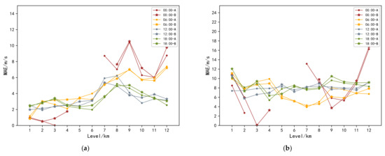 Firstly, the data of 00:00, 06:00, 12:00, 18:00 and their nearby periods were selected for wind field retrieval. The results shown in Figure 8a,b are the line charts of the changes in wind speed and wind direction in four periods, respectively. The results showed that the estimated stability of wind speed and direction at 00:00 was low, and there were no retrieval values at many altitudes. This paper analyzes the possible causes of these problems: for the MP model, the more data points, the better the retrieved effect. Compared with other altitudes, the retrieved results at 00:00 may not be ideal because there were too few data points in each height layer, and some height layers even had no observations. In view of the above reasons, the results of the 00:00 period had a great impact on the applicability and accuracy of the analysis model, thus this paper intends to exclude the data results of the 00:00 period.