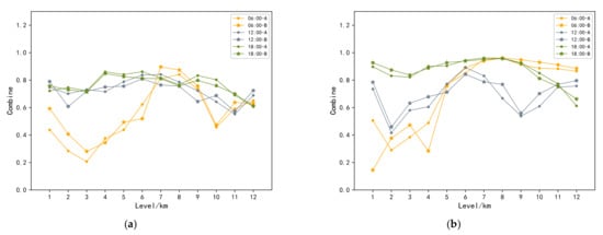 The results show that the wind speed was above 50% in most periods and more than 70% in most periods. The results have a strong correlation. The correlation of a small part of periods was less than 50%, and the retrieved effect was not ideal. Most of the of the wind direction was above 70%, and the retrieved effect was good, while a small part was below 50%, and the result was slightly worse. Further analysis shows that the lower period basically appears at 06:00 for the same reason as above. Due to the data points being relatively few and the results poor. According to the results of each period, the accuracy of the medium-height layer was relatively stable, which was generally higher than that of other layers. However, the stability of the low altitude was relatively low, which was mainly affected by the amount of data.