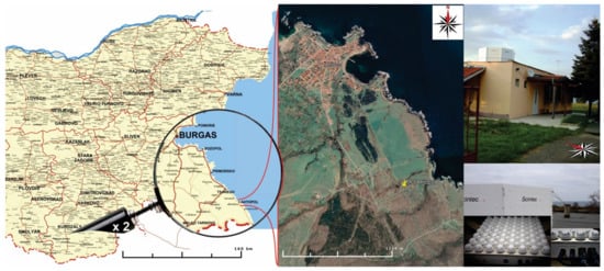 Location of Meteorological Observatory (MO) Ahtopol in southeastern Bulgaria (left) with views of the terrene (middle—Google Earth) and sodar system on the roof of the administrative building of MO Ahtopol (right). The maps are elaborated based on Google Earth.