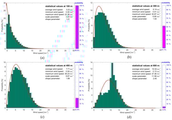 The wind speed distributions in height from the selected profiles have allowed at each vertical level the histograms to be generated and their probability distributions to be determined. In Analysis II, the two-parameter Weibull distribution for the wind speed at each measurement level has been applied using the maximum likelihood method []: