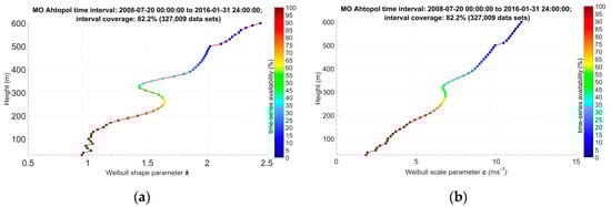 The color bars on the right side of the graphs show the percentage of the data availability with height. An almost linear change of the values in height is observed in the scale parameter profile (right), while two weak peaks at 50 and 80 m above the ground are distinguished, followed by a major peak at a height of 270–300 m and a slightly sharper change in profile values at a height of 500 m. As mentioned above, the dimensionality of this profile is the same as the wind speed (ms−1) and its values are proportional to the average wind speed values [,]. The values of the profile close to the ground start at nearly 2 ms−1, at a height of 300 m they reach approximately 6–7 ms−1, and at 600 m from the ground the values of the scale parameter are close to 12 ms−1. Relatively small peaks at a height of 50 and 80 m above the ground are observed in the shape parameter profile (Figure 4a) with values close to 1.05, a pronounced peak at 260 m with values around 1.65, relatively sharp change in the values at 500 m and at a height of 600 m the value is nearly 2.45. Lower peaks can be associated with the height of IBL or surface layer [,].