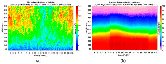 Averaged diurnal wind speed variation in height (a) diurnal data availability (b) for continuous profiles from 100 m above the ground.