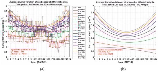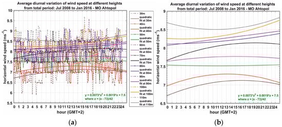Average (of 2357 days) diurnal variation of wind speed at different heights (colors of dashed lines: 30 m—brown, 40 m—red, 50 m—green, 60 m—pink, 70 m—black, 80 m—blue, 90 m–100 m—orange, 110 m—grey) with applied quadratic functions (a) and display of the quadratic functions only (b).