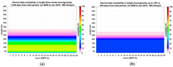 Only temporally homogenized diurnal data availability variation ((a)—availability up to 1538 days out of a total of 2357) and simultaneously spatially (up to 180 m above the ground) and temporally homogenized diurnal data availability variation ((b)—availability up to 456 days) for the study period.