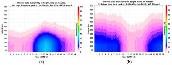 Spatially and temporally diurnal data availability of marine air masses (a) and land air masses (b) of profiles with data availability at 100 m above the ground and continuity data after this height.