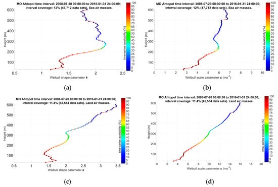 The results from the applied two-parameter Weibull distribution in height are presented in Figure 10 for marine (a and b) and land (c and d) air masses with graphs of shape (a and c) and scale (b and d) parameters profiles. With the shape parameter of the marine air masses, similar peaks are observed in the values at almost the same heights as in Figure 4—two small peaks at a height of 50 and 80 m and one pronounced peak at 270–280 m above the ground. The small peaks could again be associated with IBL height, while the 270–280 m peak with the mean height of the upper edge of the breeze cells core with maximum speed in the wind field (an indication of the maximum wind zone in the quasi-stationary period of the sea breeze) []. Higher values of this parameter are observed at land air masses with a marked peak of 50 m reaching values of 1.70, followed by a sharp decrease in the profile values up to 110 m, and then raising again to form a pronounced peak with a value close to 2.1 at 270–290 m, which height is close to those have been previously reviewed (260 m at all air masses in Figure 4a, and 270–280 m at marine air masses in Figure 10a). After this pronounced peak, the land air masses shape profile values grow almost linearly reaching 3.4 at 600 m height, with a very low peak observed at 430 m height. In the marine air masses scale parameter profile (Figure 10b) a slower increase of the values in height compared to that in Figure 4b is observed as well as a small peak at 80–90 m height and a significantly more pronounced peak at 230–250 m. The land air masses scale parameter profile (Figure 10d) has the highest values of those considered so far, starting with 3 ms−1 and growing almost linear. At 300 m height the value is close to 10 ms−1, at 500 m–14 ms−1 and at 600 m over 18 ms−1. Peaks are also observed with it, but due to the relatively rapid increase in height, they are not clearly expressed. Two peaks are observed close to the ground at 50 and 80 m height and one at about 290–300 m.