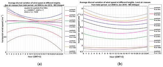 Quadratic functions fit to the averaged diurnal variation of wind speed at different heights from spatially and temporally inhomogeneous data of marine (a) and land (b) air masses.