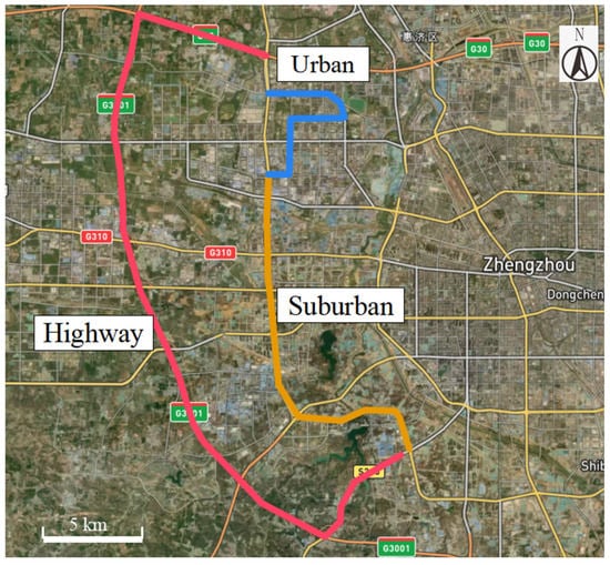A test route was designed for the PEMS experiment according to the regulations of Real Driving Emission Test (Type II test) in Limits and measurement methods for emissions from light-duty vehicles (CHINA 6). As shown in Figure 1, the total length was approximately 62.4 km, including urban roads, suburban roads and highway roads. The maximum speeds driving on the urban, suburban and highway roads were 40~60 km/h, 70~80 km/h and 110~120 km/h, respectively. The average driving distance of urban, suburban and highway roads is 12.4 km, 17.6 km and 32.4 km, respectively, and the detail data for each trip of these test vehicles could be found in Table S1 in the Supplementary Materials. The average measured time over urban, suburban and expressway were 39.3 min, 28.5 min and 25.4 min, respectively.