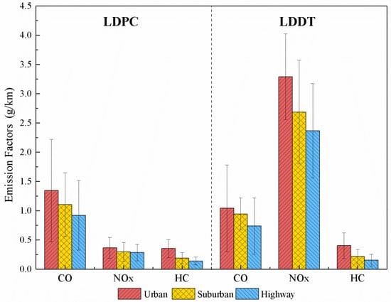 The average CO, NOx, HC EFs of LDPCs and LDDTs under different road conditions are shown in Figure 2. The specific data could be found in Table S2 in Supplementary Materials. Figure 2 represents the average of four driving tests of two test vehicles, and those of LDDT were the average result of three test vehicles with a total of six driving tests. In general, there was a trend that the average emission factors of CO, NOx and HC under urban road conditions were slightly higher than the ones for suburban and highways. Specifically, CO emissions of LDPCs on suburban and highway decreased by 18.0% and 31.5%, respectively, compared with urban roads; NOx emissions was also reduced by 18.4% and 22.1%; and the reduction of HC was even greater, reaching 46.6% and 60.2%, respectively. For LDDTs, CO emissions under urban road conditions were 1.04 ± 0.74 g/km, and those under suburban road conditions and highway road conditions were 0.94 ± 0.27 g/km and 0.74 ± 0.48 g/km respectively. The NOx EFs under suburban and highway road conditions were 3.29 ± 0.73 g/km and 2.69 ± 0.89 g/km, which were reduced by 18.2% and 28.3% compared with urban road conditions. Consistent with LDPCs, the change in HC emissions was also more obvious. The HC EFs were 0.40 ± 0.22 g/km under urban road conditions, which was 1.9 times and 2.6 times those under suburban and highway road conditions, respectively.
