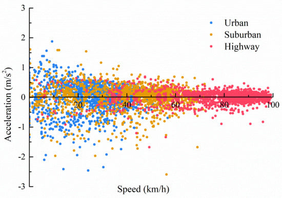 The acceleration vs. speed plot driving on three road conditions during a normal test trip of LDDT3 (China V) was shown in Figure 3. Clearly, urban driving presented the lowest speed, mainly concentrated in 0–40 km/h, whereas the speed of suburban driving and highway driving were concentrated in 40–60 km/h and 70–100 km/h, respectively. In addition, Figure 3 also showed that accelerations during urban driving and suburban driving conditions were significantly higher than those of highway driving conditions. The average-, median- and maximum-speeds on three road conditions were listed in Table S3 in Supplementary Materials.