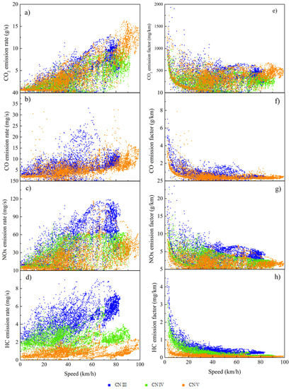 Data of LDDTs complying with China III, China IV, and China V emission standards. Instantaneous EFs (a–d) and emission factors (e–h) of CO, HC and NO at various speeds.