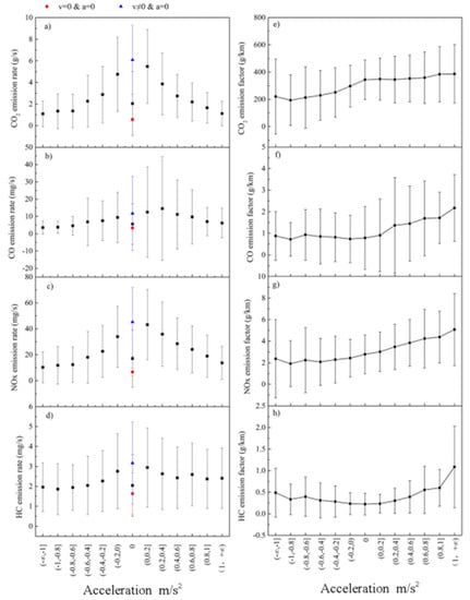 The accelerations were divided into 12 bins with a 0.2 m/s2 interval in this study. Under normal cruise conditions, the emission rates of NOx and HC reach the peak at 0 m/s2, and the peak of CO occurred at acceleration a little higher than 0 m/s2. There were no significant changes in EFs of CO, NOx, and HC when the acceleration was smaller than 0 m/s2, and an upward trend of the EFs was found with increasing speed when the acceleration was positive.