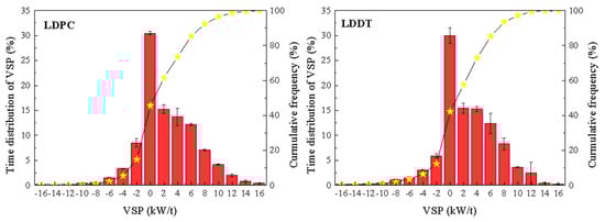 Figure 6 shows the VSP interval distribution characteristics of LDPC and LDDT. It can be seen from the Figure 6 that the VSP of each model is mainly distributed between −15–15 kw/t, accounting for 98.7–99.6% of the test time. The VSP of LDPC is only 14.4% in the negative range, 30.4% in Bin0 distribution, and 55.2% in the positive range. The VSP of LDPC is mainly distributed in (−3, −1], (−1, 1], (1, 3], (3, 5], (5, 7] and (7, 9] range, which indicates that LDPC drives in a relatively stable state most of the time, and the proportion of rapid acceleration and deceleration is relatively low. The VSP distribution of LDDT and LDPC is similar. The proportion of VSP in the negative range is only 12.3%, in Bin0 distribution is 30.0%, and in the positive range is 57.7%, which indicated that the VSP distribution of LDDTs and LDPCs were consistent under the same driving conditions.
