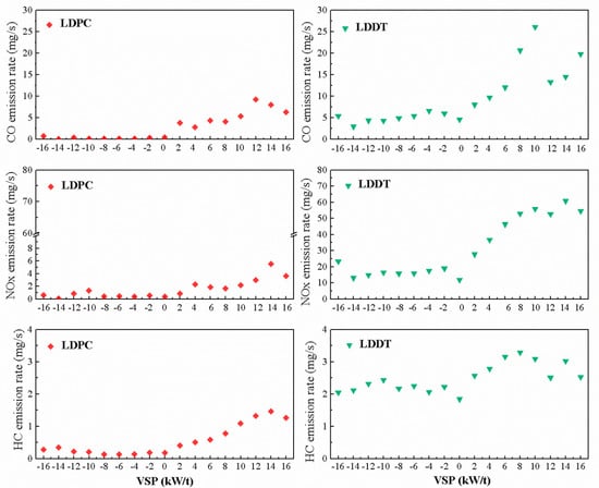 The VSP was divided into 17 bins with a 2 kW/t interval in this study. VSP of these test vehicles was mainly distributed between −15–15 kW/t, accounting for 98.7–99.6% of the test time. When VSP < 0, CO, NOx, and HC emissions were lower, and changes in VSP had less impact on pollutant emissions. For both LDPCs and LDDTs, the lowest emission rates of exhaust pollutant were generally occurred in the Bin0 interval, except NOx emissions. When VSP > 0, CO, NOx, and HC emission rates increased obviously, the gaseous emission rates decreased when the VSP was too high.