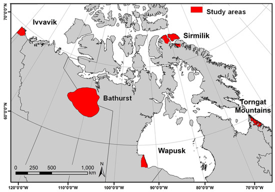 The distribution of five study areas in arctic Canada: three mountainous national parks (i.e., Ivvavik, Sirmilik, and the Torngat Mountains) and two relatively flat areas (i.e., Wapusk National Park, and Bathurst caribou summer range and calving ground).