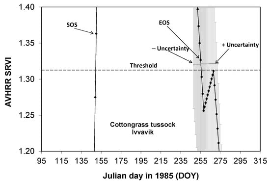 Similarly, the EOS was determined as the DOY on which the class mean of AVHRR SRVI last became less than the threshold in the fall. Given that in the Arctic snow could sometimes revisit a vegetated area around SOS or EOS, i.e., there could be multiple crossings of AVHRR SRVI through the threshold. Therefore, only the first crossing with 90% confidence in the spring would be determined as SOS, in which all other days before this date had no value of (the class mean of AVHRR SRVI—its one standard estimation error) was larger than the threshold. Similarly, only the last crossing with 90% confidence in the fall would be determined as EOS.