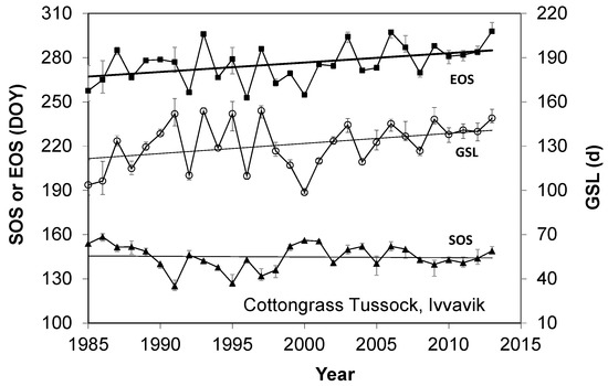 Example inter-annual variations and trends in SOS, EOS, and GSL during 1985–2013 for the cotton-grass tussock class in the Ivvavik National Park. Error bars show one standard estimation errors in SOS, EOS, or GSL. Statistics for these trends are listed in Table 2.