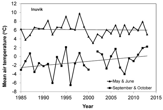 These phonological results corresponded well with the fall (i.e., September and October) and spring (i.e., May and June) temperature trends during the same period at the Inuvik climate station, located about 130 km east of the Ivvavik National Park. As Figure 4 shows, the fall temperature increased 2.63 °C during 1985–2013 and was significant at the 90% confidence level, while the spring temperature decreased slightly by 0.19 °C and was statistically not significant (Table 3).