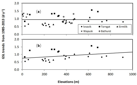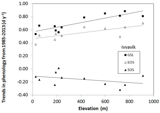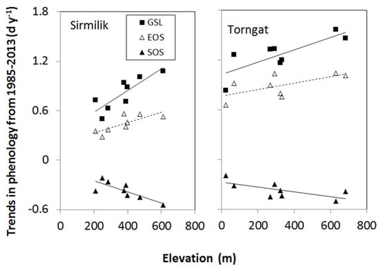 With contributions from both effects of elevation on EOS and SOS trends, significant relationships between GSL trends and elevation were found for the tundra classes in the Sirmilik (R2 = 0.71, p-value = 0.008) and Torngat Mountains National Parks (R2 = 0.63, p-value = 0.019). Over the 403 m elevation range from the lowest class to the highest class in the Sirmilik National Park, the GSL trend increased 89%, from 0.59 to 1.12 d y−1 during 1985–2013. Of the 0.53 d y−1 elevation-induced increase in GSL trend, the effect of elevation on EOS trend contributed 0.25 d y−1, while that on SOS 0.27 d y−1. Similarly, the 661 m difference in elevation from the lowest class to the highest class in the Torngat Mountains National Park increased the GSL trend by 47%, from 1.04 to 1.54 d y−1 during 1985–2013. Of the 0.49 d y−1 elevation-induced increase in GSL trends, 0.28 d y−1 came from the effect of elevation on EOS trends, while 0.21 d y−1 from the effect of elevation on SOS trends.
