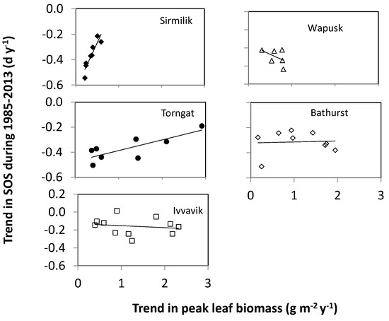 Relationships between trends in SOS and peak leaf biomass during 1985–2013 over all five study areas: Sirmilik (R2 = 0.84, p-value = 0.001, n = 8), the Torngat Mountains (R2 = 0.63, p-value = 0.018, n = 8), Ivvavik (R2 = 0.03, p-value = 0.64, n = 11), and Wapusk National Parks (R2 = 0.24, p-value = 0.33, n = 6), and the Bathurst caribou range (R2 = 0.003, p-value = 0.89, n = 9).