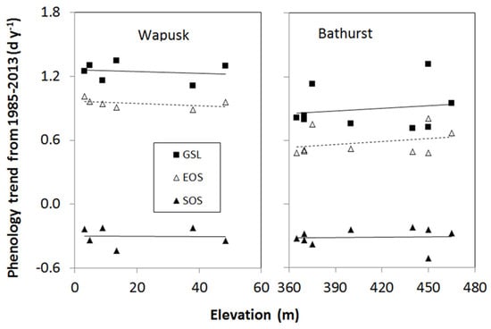 Relationships between SOS, EOS, or GSL trends during 1985–2013 and elevation over the two flat study areas: the Wapusk National Park and the Bathurst caribou summer range and calving ground. Statistics for these relationships are listed in Table 4.