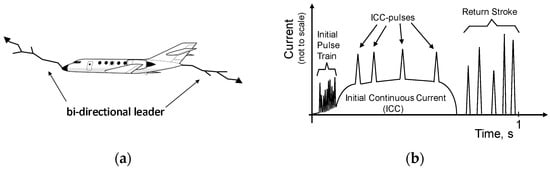 7]. The most frequent scenario (about 90% of recorded events) involves lightning triggered by the aircraft itself. This may happen when the aircraft flies in regions where the ambient electric field is so intense that a leader starts from the aircraft in the direction of the ambient electric field. A few milliseconds later this leader is followed by a second leader of inverse polarity which develops in the opposite direction. In this way, a bi-directional leader is formed, as shown in