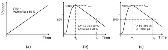 25], although natural electric field pulses may have a concave waveform. The tests were verified using the fast-rising high-voltage waveform B. Finally, the current carrying capacity of the designed lightning protection measure was tested. For this purpose, the lightning current component A was applied to two samples. One used a design based on a segmented diverter strip, while the other used a combination of a solid and a segmented diverter strip.
