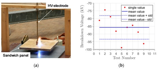 Table 1 summarizes the results of the voltage tests with waveforms A, B, and D. The values represent the arithmetic means based on at least 5 individual tests at each sample used. The breakdown voltage tests were performed at different locations on the sample with a minimum spacing of 100 mm. A total of 16 identical A-sandwich samples were tested.