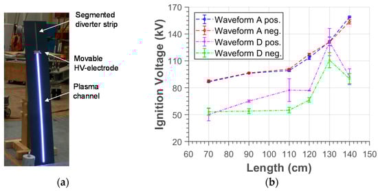19]. The diagram shows that the ignition voltage (average value) increases with increasing length of the strip, which was varied between 70 cm and 140 cm. The standard deviation values are also shown in