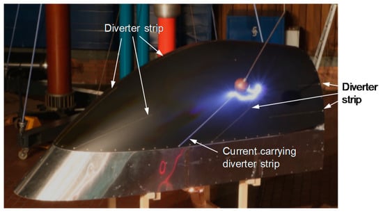Figure 8 shows an example for the high-voltage tests with an electrode which was placed at different locations above the radome prototype. The arc was successfully redirected to 1 segmented diverter strip (although a creeping of the plasma channel on the radome surface was observed in this particular case). The tests were performed with high-voltage waveform D and positive and negative polarity, following the recommendations of reference [
