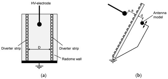 Figure 7 shows the schematic drawing of the test setup from the top and from the side. The strip length (length of the tested section of the diverter strip) is adjusted by a movable HV-electrode. The antenna model is grounded and located at the relevant distance (d) away from the rear side of the radome wall. The chosen distance d corresponds to the minimum distance of the antenna to the inner radome wall structure of the satcom radome shown in