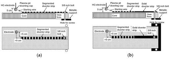 Figure 11a). The second configuration represents a hybrid protection system consisting of the combination of a solid and a segmented diverter strip. The solid diverter strip was electrically connected to the metallic structure using a metallic grounding bolt. Particular attention was paid to the transition from the segmented to the solid diverter strip (see