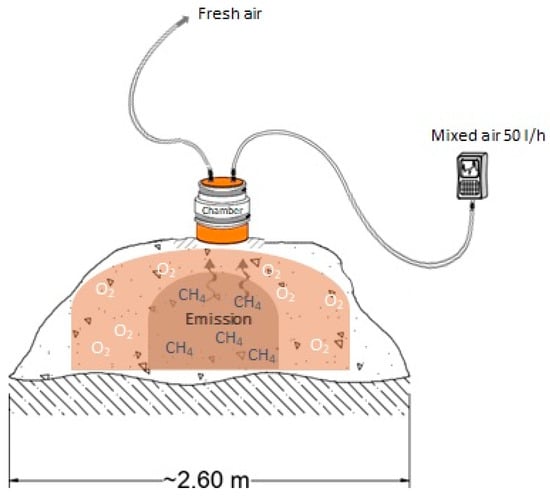 The flow quantifies emission rates through the flux chamber related to the treatment and quality of composting. After identifying a spot, the area is encapsulated to form an aerated chamber. A defined amount of air is extracted, covering the entire area required for sampling to function the constant flow of emissions and supply of ambient air. The flux chamber allows the flux gas to diffuse, which can measure the methane concentration over time and estimate the flux gas emission [38,39] The result is the volumetric flow rate extracted per unit of time [40]. Several factors were considered for the emissions rate calculation: the sampling chamber and chamber area, the volume, and flow volume. Methane emissions rates were calculated in g × m−2 × h−1 with following the equation [10,33,41,42]: