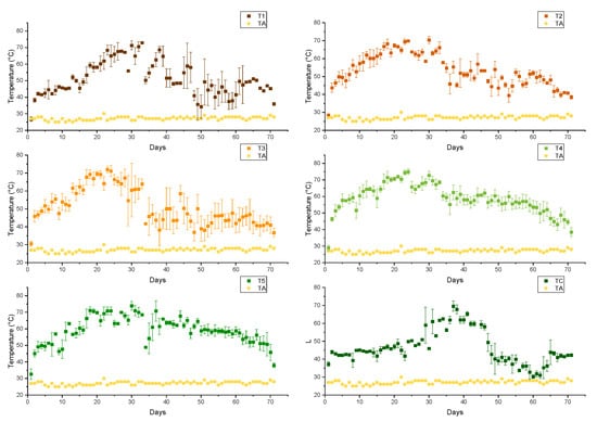 Figure 3. Temperature profiles in all the types of windrows. TA: ambient temperature. Bars represent the standard error of the mean (n = 4).