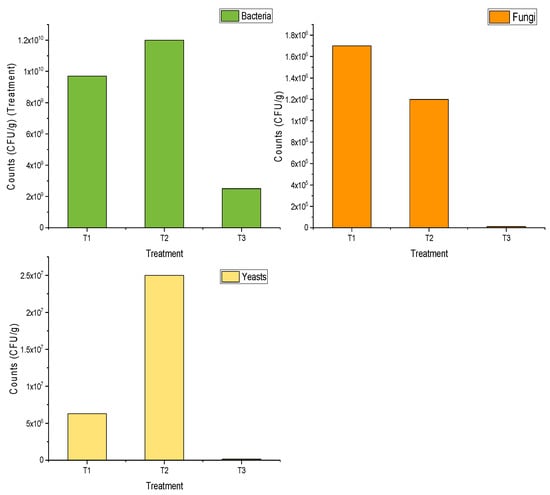 Microbial activity, including bacteria, fungi, and yeast, depends on temperature and moisture content [27]. The aim of this study was not the microbial counts weekly during the composting process. Instead, a general overview of the microbial activity was considered important to control the microbes in at least two treatments to ensure that the activity is higher than the control TC with the proposed technique. Quantitative analysis was based on colony counts and subsequent calculation of colony-forming units per gram (CFU/g) to estimate the viable number of bacteria, fungal cells in the samples during the third week of composting process for TC, T1, and T3 (Figure 4).
