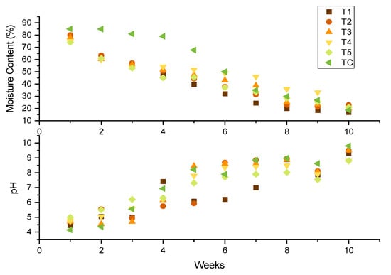 Each windrow treatment varied regarding the response to water consumption and evaporation. The monitoring was important during the composting process to obtain sufficient conditions for T1–T5 and compare with the current treatment at mill TC. Over ten weeks, moisture content was measured among the different windrows represented in Figure 5. During the first week, all the treatments showed a high moisture content due to the high levels of moisture that CP possesses by itself (Table 2). After the second week, all the windrows except TC reached the recommended moisture content levels for the composting process. Thus, TC has reached the levels recommended after six weeks of the process. In TC occurred no variation during four weeks of pile age. The high value is attributed to the high MC of the coffee by-product. T1–T5 had rapid absorption with the percentages of the mixture of GW and CP. It was observed that the highest amount GW added in the windrow, the fastest was the reduction of the MC in the system after the second week of the composting process.Additionally, pH directly influences composting due to its action on the dynamics of microbial processes [52]. For this study, pH in all windrows rapidly increases within three weeks of all the treatments (Figure 5), showing a tendency. Subsequently, an alkaline state was seen for the rest of the composting process. Some authors have seen a link between the loss of organic acids and the generation of ammonia from the decomposition of proteins and this alkaline state [10,53,54,55]. In all the windrows, at the end of the process, the pH of the treatments was basic (8.8–9.8), indicating maturity since lower pH values would indicate anaerobic processes [56].