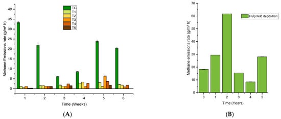 Figure 6. (A) Methane emissions rate for all the treatments using coffee pulp for composting and (B) methane emissions rate in field deposition. Bars represent the standard error of the mean (n = 4).