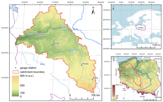 Due to the large latitudinal and longitudinal extent of the Warta River catchment area, regional differences in climatic conditions are visible within its range. The area belongs to nine climatic regions [57]. The average annual temperature in the river basin ranges from 7.5 °C in the north to 8.5 °C in the west. Annual precipitation totals range from 520 mm in the northeast to 675 mm in the south.