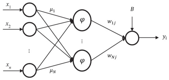 The idea of the RBF network is based on the solutions of statistical methods of approximating the function of a numeric variable. A typical RBNFN is a structure containing: an input layer on which signals described by the input vector are applied, a hidden layer with radial neurons (weights correspond to cluster center, usually the Gaussian function), and an output layer normally composed of one neuron (linear weighted sum), whose role is the weight summation of signals from hidden neurons [71]. Figure 3 presents the topology of the RBF model as a multi-input–single-output network composition.