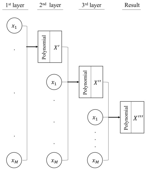 where {x1, x2, x3 …}: inputs; {a, b, c …}: polynomial coefficients; and y: the node output. Figure 4 shows a schematic diagram of a GMDH model with three layers and M numbers of input variables.
