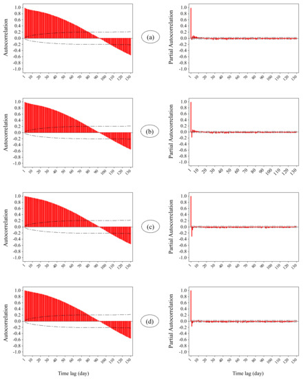 To predict TRW, an input variable was determined in an initial step. To make a reasonable comparison between several models, they must use the same input variables. As the stochastic models can only use the main variable’s previous amounts (time lags) as inputs, it is logical to use the time lags of TW for neural network models too. In this study, therefore, the daily time lags of TRW for each hydrometric station were investigated through Autocorrelation (ACF) and Partial Autocorrelation (PACF) functions. The graphs of these two functions are presented in Figure 6.