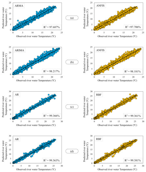 The evaluation in this step is performed using the RMSE and MAE criteria (Table 2). Since the validity of the numerical models is specified during their test periods, in this table we discuss the test phase for the stations. At first glance, we can see partial differences between the AI and the stochastics. Among the stochastic methods, the MA had the highest prediction errors, but the others—including AR, ARMA and ARIMA—had better performance. Among the AI methods, the best performance was displayed by the ANFIS and RBF models, with the GMDH was the weakest AI model. For the Bobry station, ARMA was the best stochastic model, with RMSE = 0.920 °C and MAE = 0.690 °C, while ANFIS with inputs of ACF had the highest accuracy among AIs (RMSE = 0.916 °C and MAE = 0.694 °C). In a similar scenario for the Sieradz station, the ANFIS was reported as the best AI, and the ARIMA as the best stochastic model. For the Poznań and Gorzow Wielkopolski stations, the criteria values were less than for the previous stations (RMSE values of about 0.6 °C and MAE of about 0.4 °C), and the AR and RBF models were the best among the stochastic and AI models, respectively. Furthermore, there was no significant reported superiority when comparing ACF and PACF input selectors. Scatter plots were drawn to make a graphical comparison between the prediction results of the stochastics and the AIs (Figure 7).