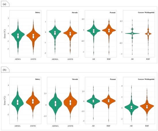 Figure 8 presents a selection of the best stochastic and AI models (according to the bold rows of Table 2), with violin plots drawn separately for the highest and lowest deciles, by station. On the basis of the vicinity of the violins’ main curvature to the Error = 0 °C line, it is demonstrated that all the models are suitable for both of the extreme deciles. A comparison of the models makes it obvious that the violins’ main curvatures in stochastic models are somewhat closer to the Error = 0 line than in AI models. The clearest examples of this are the Bobry and Sieradz stations in the lowest decile, and the Bobry and Gorzow Wielkopolski stations in the highest decile. When comparing the two studied deciles, we see clearly that the violins are wider in the highest decile and more acute in the lowest. This demonstrates that the lowest TRW decile has less errors and can achieve better predictions through numerical models than the highest decile. If looked at from another perspective, the plots (Figure 8) generally show that the curvatures are sharper for Poznań and Gorzow Wielkopolski stations, which indicates that the TRW at these two stations offers better predictions than at Bobry and Sieradz.